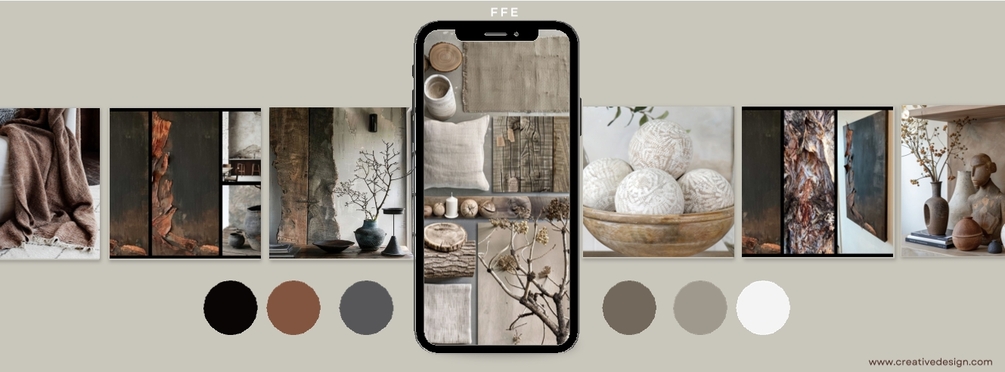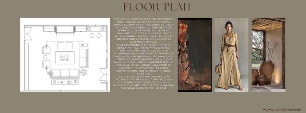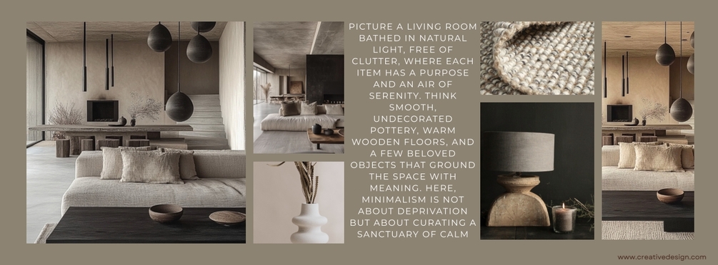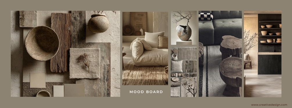 Step into a living space bathed in natural light and grounded in soulful simplicity. This Stella Interiors mood board reinterprets Wabi Sabi philosophy through a lens of warm minimalism—where every object is intentional, every texture invites touch, and imperfection is embraced as beauty.